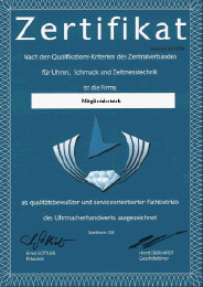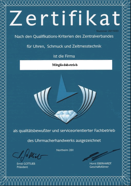 - zertifizierte Betriebe unterliegen der regelmäßigen Kontrolle durch den Zentralverband für Uhren Schmuck und Zeitmesstechnik